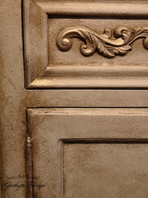 Van Dyke Brown glaze, klar og mørk voks og gullpatina...